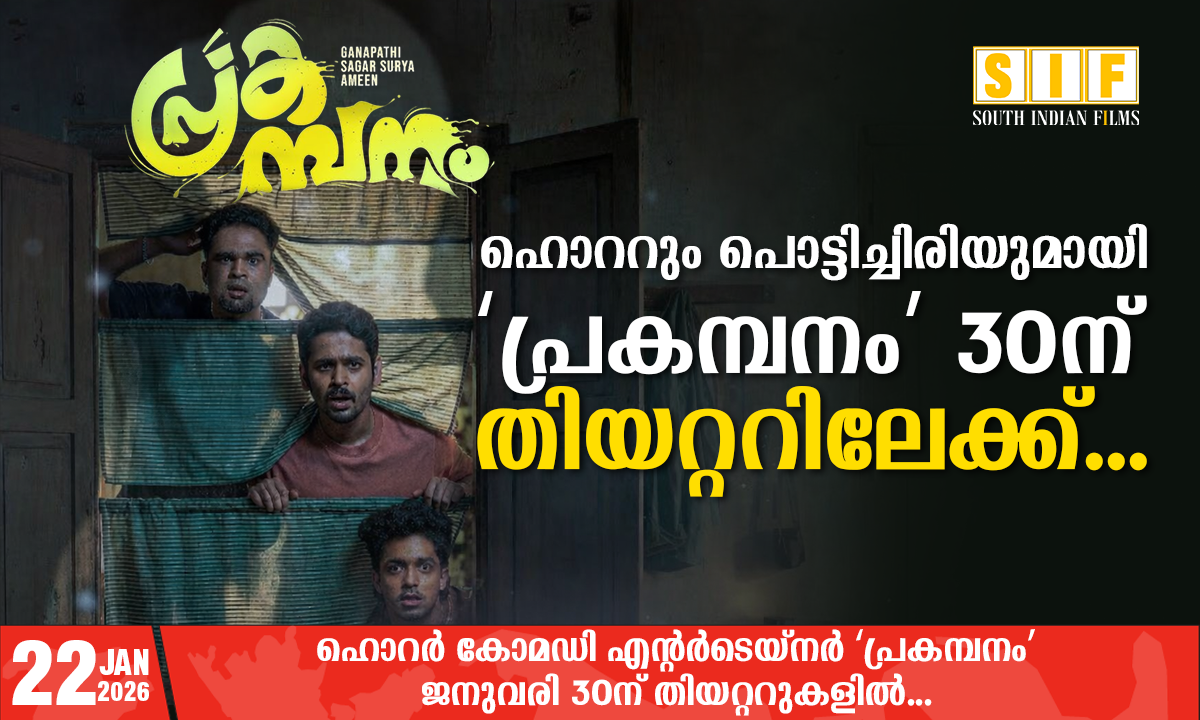 യുവതാരങ്ങളായ ഗണപതിയും സാഗർ സൂര്യയും കേന്ദ്രകഥാപാത്രങ്ങളെ അവതരിപ്പിക്കുന്ന ‘പ്രകമ്പനം’ ജനുവരി 30-ന് ലോകമെമ്പാടുമുള്ള തിയറ്ററുകളിൽ പ്രദർശനത്തിനെത്തുന്നു. ‘നദികളിൽ സുന്ദരി യമുന’ എന്ന ശ്രദ്ധേയമായ ചിത്രത്തിന് ശേഷം വിജേഷ് പാണത്തൂർ സംവിധാനം ചെയ്യുന്ന ഈ ചിത്രം ഒരു ഹൊറർ-കോമഡി എന്റർടെയ്നറാണ്. കൊച്ചിയിലെ ഒരു മെൻസ് ഹോസ്റ്റലിന്റെ പശ്ചാത്തലത്തിൽ ഒരുങ്ങുന്ന ചിത്രം, ഹോസ്റ്റൽ ജീവിതത്തിലെ രസകരവും അതോടൊപ്പം ഭീതിയുണർത്തുന്നതുമായ സംഭവവികാസങ്ങളാണ് പ്രേക്ഷകർക്ക് മുന്നിലെത്തിക്കുന്നത്.
